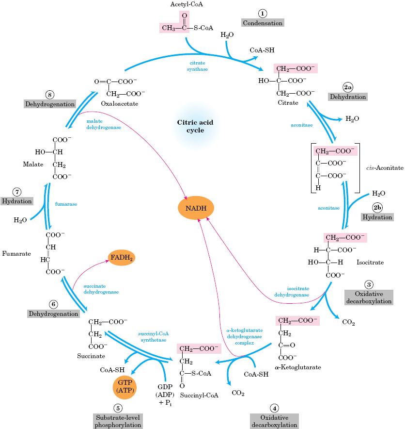在三羧酸循環(huán)中,反應物葡萄糖或者脂肪酸會(huì )變成乙酰輔酶A。這種“活化醋酸”(一分子輔酶和一個(gè)乙?;?/span>相連),會(huì )在循環(huán)中分解生成最終產(chǎn)物二氧化碳并脫氫,質(zhì)子將傳遞給輔酶煙酰胺腺嘌呤二核苷酸(NAD+)和黃素腺嘌呤(FAD),使之成為NADH + H+和FADH2。NADH + H+和FADH2會(huì )繼續在呼吸鏈中被氧化成NAD+和FAD,并生成水。這種受調節的“燃燒”會(huì )生成ATP,提供能量。